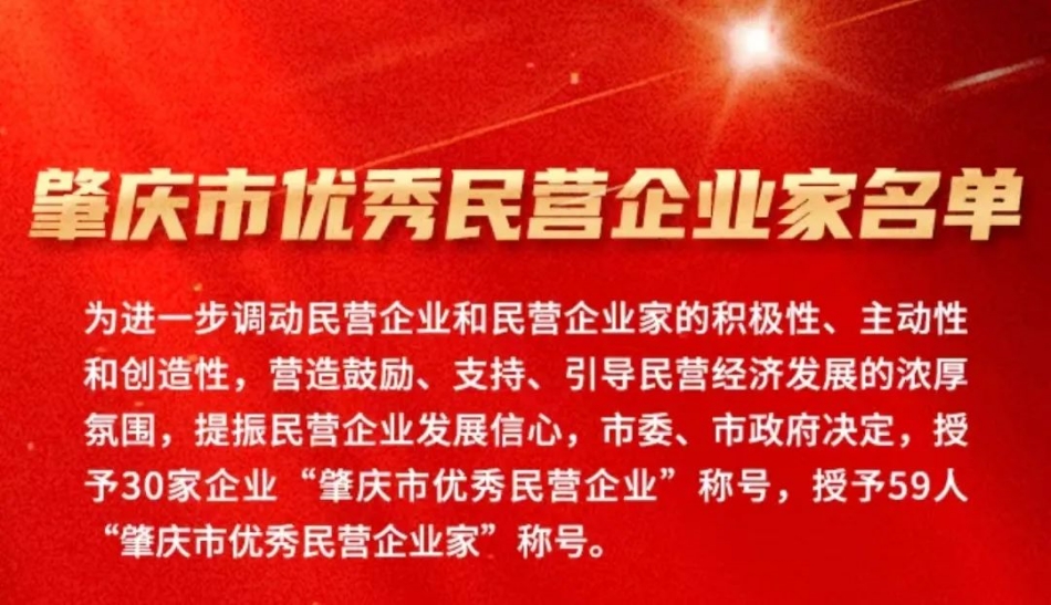 為進(jìn)一步調(diào)動(dòng)民營企業(yè)和民營企業(yè)家的積極性、主動(dòng)性和創(chuàng)造性,營造鼓勵(lì)、支持、引導(dǎo)民營經(jīng)濟(jì)發(fā)展的濃厚氛圍,提振民營企業(yè)發(fā)展信心,市委、市政府決定,授予30家企業(yè)“肇慶市優(yōu)秀民營企業(yè)”稱號(hào),授予廣東健奧科技有限公司董事長石榮等59人“肇慶市優(yōu)秀民營企業(yè)家”稱號(hào)。